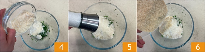 In der Zwischenzeit kümmern Sie sich um die Panade: Geben Sie die gehackte Petersilie in eine Schüssel, fügen Sie dann den geriebenen Parmesan 4, das Salz 5 und das Paniermehl 6 hinzu.
