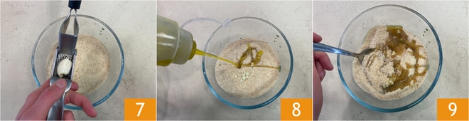 Fügen Sie auch die zerdrückte Knoblauchzehe 7, die geriebene Zitronenschale und das Öl 8 hinzu. Mischen Sie die Mischung gut durch 9.