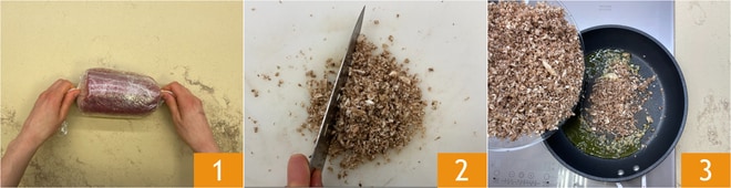 Um das Filet Wellington vorzubereiten, bereiten Sie zuerst die Fleischbrühe zu und salzen Sie sie vorsichtig. Entfernen Sie das überschüssige Fett vom Rinderfilet und wickeln Sie es dann fest in Frischhaltefolie 1. Lassen Sie es 30 Minuten im Kühlschrank ruhen. In der Zwischenzeit reinigen Sie die Pilze und hacken sie fein mit einem Messer 2. Erhitzen Sie einen Schuss Öl in einer Pfanne, geben Sie dann den Knoblauch und die Pilze hinzu 3.