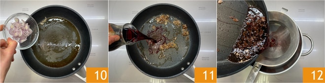 Geben Sie die fein geschnittenen und bemehlten Schalotten in die Pfanne, in der Sie das Filet gekocht haben 10. Dünsten Sie sie einige Minuten, dann löschen Sie mit Rotwein ab 11. Wenn der gesamte Alkohol verdampft ist, filtern Sie alles durch ein Sieb und sammeln Sie die Flüssigkeit in einem Topf 12.