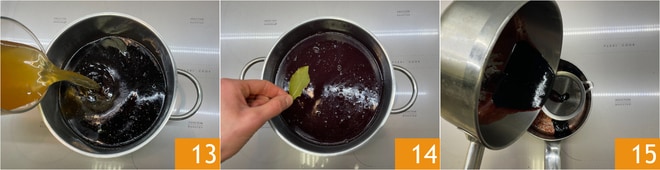 Fügen Sie die Rinderbrühe hinzu 13, ein Lorbeerblatt 14 und reduzieren Sie die Sauce auf drei Viertel; sie sollte weder zu flüssig noch zu dick sein. Filtern Sie erneut 15.