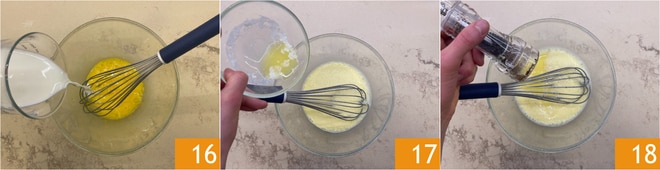 Wenden Sie sich nun der Zubereitung der Crêpes zu: Schlagen Sie in einer Schüssel das Ei, geben Sie dann die Milch 16 und die geschmolzene und abgekühlte Butter hinzu 17. Würzen Sie mit Salz und Pfeffer 18.