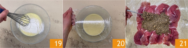 Fügen Sie auch das Mehl hinzu 19 und mischen Sie mit einem Schneebesen, bis Sie eine homogene und klumpenfreie Mischung erhalten. Decken Sie die Schüssel mit Frischhaltefolie ab und lassen Sie sie 30 Minuten im Kühlschrank ruhen 20. Legen Sie den rohen Schinken auf ein Blatt Frischhaltefolie und überlappen Sie die Scheiben leicht, um ein Rechteck zu bilden, dann verteilen Sie darauf eine Schicht Pilze 21.