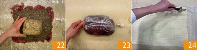 Legen Sie das Rinderfilet auf die Pilze 22, dann rollen Sie die Schinkenscheiben um das Fleisch und wickeln es fest in die Frischhaltefolie. Schließen Sie es gut wie ein Bonbon 23 und legen Sie es für 30 Minuten in den Kühlschrank. Schneiden Sie in der Zwischenzeit den Blätterteig in 2 cm breite Streifen 24.