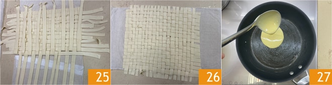 Beginnen Sie, die Streifen zu flechten 25, bis Sie ein Geflecht wie bei einem Weidenkorb gebildet haben 26, und legen Sie es beiseite. Nehmen Sie den Teig für die Crêpes und mischen Sie ihn, um ihn wieder weich zu machen. Fetten Sie eine Antihaft-Pfanne mit Butter ein, und wenn sie heiß ist, gießen Sie eine Kelle Teig in die Mitte. Drehen Sie die Pfanne so, dass der gesamte Boden mit der Mischung bedeckt ist 27.