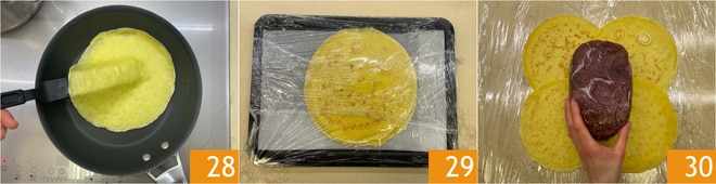 Kochen Sie es eine Minute bei mittlerer bis niedriger Hitze; wenn die Ränder sich zu lösen beginnen, drehen Sie die Crêpe um 28 und kochen Sie sie auch von der anderen Seite. Wiederholen Sie den gleichen Vorgang, bis die Mischung aufgebraucht ist, mit diesen Mengen sollten Sie 4 Crêpes erhalten. Stapeln Sie sie auf einem mit Backpapier ausgelegten Blech und bedecken Sie sie mit Frischhaltefolie 29, so bleiben sie bis zur Verwendung weich. Wenn die Ruhezeit des Filets vorbei ist, legen Sie die Crêpes leicht überlappend auf ein Blatt Frischhaltefolie und platzieren Sie das Filet in der Mitte 30.