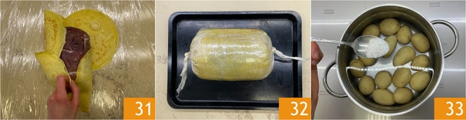 Bedecken Sie es mit den Crêpes 31, wickeln Sie dann alles in die Frischhaltefolie und schließen Sie es wie ein Bonbon 32. Lassen Sie es 30 Minuten im Kühlschrank ruhen. In der Zwischenzeit kümmern Sie sich um die Zubereitung des Kartoffelpürees: Kochen Sie die Kartoffeln in kaltem, gesalzenem Wasser 33, es dauert je nach Größe etwa 30-40 Minuten. Währenddessen erhitzen Sie die Milch in einem separaten Topf.