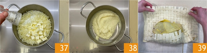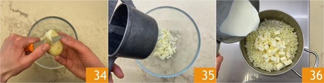 Nachdem Sie die Kochzeit mit einer Gabel überprüft haben, lassen Sie die Kartoffeln abtropfen und abkühlen, dann entfernen Sie die Schale 34. Zerdrücken Sie die Kartoffeln 35 und geben Sie sie in einen Topf, dann fügen Sie die Butter und die heiße Milch hinzu 36.