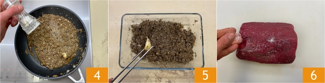 Würzen Sie mit Salz und Pfeffer 4 und kochen Sie auf hoher Flamme, bis sie trocknen. Übertragen Sie sie in eine Schüssel 5 und lassen Sie sie vollständig abkühlen. Nehmen Sie das Filet wieder auf und würzen Sie es mit Salz 6.