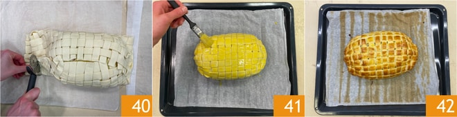 Schneiden Sie den überschüssigen Blätterteig ab 40. Legen Sie das Filet auf ein mit Backpapier ausgelegtes Blech und bestreichen Sie den Teig mit dem Eigelb 41. Backen Sie es im vorgeheizten Umluftofen bei 180° für 35-40 Minuten, je nach gewünschtem Gargrad 42.
