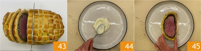 Nach dem Backen lassen Sie das Filet einige Minuten ruhen, bevor Sie es in Scheiben schneiden 43. Richten Sie es an, indem Sie das Kartoffelpüree auf dem Tellerboden verteilen 44, dann legen Sie eine Scheibe Filet darauf 45.