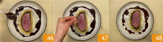 Vervollständigen Sie es mit der Rotweinsauce 46 und einer Prise Maldonsalz 47. Ihr Filet Wellington ist bereit zum Servieren 48!