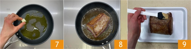 Gießen Sie einen Schuss Öl und die Butter in eine Pfanne 7, schmelzen Sie sie dann. Bräunen Sie alle Seiten des Filets bis zur goldenen Farbe 8. Lassen Sie es abkühlen und bestreichen Sie alle Seiten mit Senf 9.
