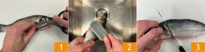 Um das Wolfsbarschfilet mit karamellisiertem Fenchel und Orangensauce zuzubereiten, widmen Sie sich zunächst der Reinigung des Wolfsbarschs. Schneiden Sie den Bauch auf, bis unter den Kopf, entfernen Sie die Innereien und spülen Sie unter fließendem Wasser, um alle Verunreinigungen zu beseitigen. Schneiden Sie die Bauchflossen ab 1. Schuppen Sie den Fisch mit einem entsprechenden Werkzeug oder mit der Messerrückseite unter fließendem Wasser 2. Machen Sie einen schrägen Schnitt 3, kurz nach den Kiemen, der vom Rücken beginnt und sich mit dem Schnitt am Bauch verbindet.