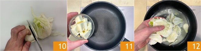 Reinigen Sie die Fenchelknollen, entfernen Sie das Grün und die härtere Basis, dann schneiden Sie sie in Scheiben 10. Schmelzen Sie die Butter in einer Pfanne 11, fügen Sie dann den Fenchel hinzu 12 und braten Sie ihn 5 Minuten unter gelegentlichem Rühren, bis er anfängt, goldbraun zu werden.