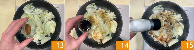Fügen Sie den braunen Zucker hinzu 13, rühren Sie um und braten Sie weitere 5-7 Minuten, der Fenchel sollte karamellisiert und weich sein. Gießen Sie den Balsamico-Essig in die Pfanne 14, würzen Sie mit Salz und Pfeffer 15. Rühren Sie noch einmal um, um die Gewürze zu verteilen, dann nehmen Sie die Pfanne vom Herd, decken Sie sie ab und halten Sie sie bis zum Anrichten warm.