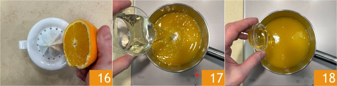 Pressen Sie die Orangen aus 16 und geben Sie den Saft in einen kleinen Topf. Fügen Sie den Weißwein hinzu 17, den Honig 18 und bringen Sie es zum Kochen.
