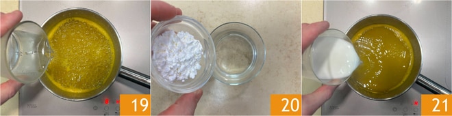Gießen Sie etwas Wasser hinzu 19 und lassen Sie die Sauce bei mittlerer Hitze etwa 10 Minuten einkochen. In der Zwischenzeit lösen Sie die Maisstärke in etwas Wasser auf 20. Nach der Zeit geben Sie die Maisstärke in die Sauce 21, rühren Sie kontinuierlich, bis sie dick wird.