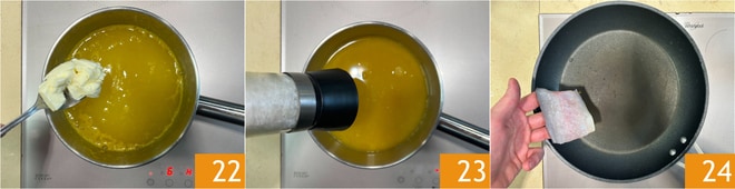 Fügen Sie die Butter hinzu 22, würzen Sie mit Salz und Pfeffer 23 und rühren Sie ein letztes Mal um. Nehmen Sie die Sauce vom Herd und halten Sie sie warm bis zum Anrichten. Erhitzen Sie eine antihaftbeschichtete Pfanne bei mittelhoher Hitze, legen Sie die Wolfsbarschfilets mit der Hautseite nach unten hinein 24.