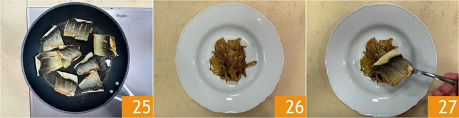 Braten Sie sie 3-4 Minuten, die Haut sollte knusprig und goldbraun sein 25. Wenden Sie die Filets und braten Sie sie weitere 2-3 Minuten. Zum Anrichten legen Sie den karamellisierten Fenchel in die Mitte des Tellers 26, legen Sie die Wolfsbarschfilets darauf 27.