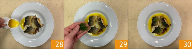 Gießen Sie die Orangensauce über den Fisch und auf den Tellerboden 28 und garnieren Sie mit Fenchelgrün 29. Ihr Wolfsbarsch mit karamellisiertem Fenchel und Orangensauce ist bereit zum Genuss 30!