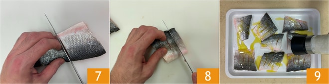 Schneiden Sie die Filets in Rauten von etwa 5-6 cm Länge 7. Machen Sie 2-3 Schnitte auf der Hautseite 8. Legen Sie sie auf ein Backblech und würzen Sie sie mit Öl und Salz 9. Beiseite stellen.