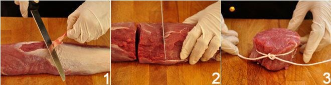 Nachdem man eventuelle faserige oder übermäßig fettige Teile vom Fleischstück entfernt hat 1, wird das Filet geschnitten 2 und gebunden 3, um es während des Kochens in Form zu halten.