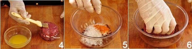Die Filets mit geschmolzener Butter bestreichen 4, dann den Rub einfach durch sorgfältiges Mischen aller Gewürze zubereiten 5 und nur die Ränder des Filets in den Rub tauchen, sodass es gut haftet (6-7). Dies ermöglicht es uns, den Garzustand des Filets an den unbedeckten Stellen zu überprüfen, was ansonsten aufgrund der dunklen Farbe des Rubs schwierig wäre.