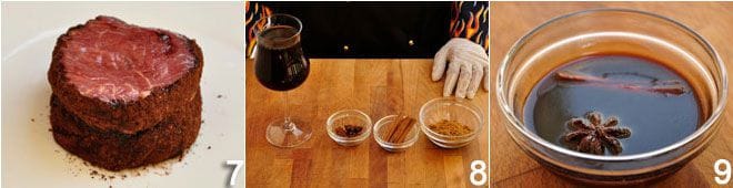 Bereiten Sie inzwischen den Grill für direktes Garen vor. In der Zwischenzeit kann die Sauce zubereitet werden 8. Der Wein wird in einen Topf zusammen mit Sternanis, Zimt und Rohrzucker gegossen. Auf kleiner Flamme köcheln lassen, bis die Sauce den Löffel überzieht. Ausschalten, in einen Behälter zusammen mit den Gewürzen überführen und abkühlen lassen 9.