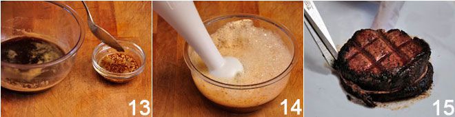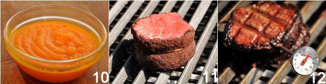 Bereiten Sie den Kaffee zu, indem Sie ein paar zerdrückte Kardamomkapseln ziehen lassen. Die Kürbiscreme 10 wird einfach durch das Backen einiger Kürbisstücke im Ofen bis zur vollständigen Karamellisierung zubereitet. Mit heißem Wasser oder Gemüsebrühe im Mixer pürieren. Mit Salz und Pfeffer abschmecken und pro Tasse Creme 4 oder 5 Tropfen Zitronensaft hinzufügen. Wenn die Kohlen bereit sind, grillen Sie die Filets 11 möglichst auf einem Gusseisengitter oder einem Grill, um sehr markante Grillstreifen zu erhalten, die auf normalen Stahldrähten nicht möglich wären. Bei der Bildung der Streifen die Filets um 90° auf der vertikalen Achse drehen, um ein Rautenmuster zu erzeugen. Wenn die Kerntemperatur 55°C erreicht hat 12, vom Feuer nehmen und das Filet in zwei Einweg-Aluminiumschalen legen, eine als Deckel verwenden. Dies ermöglicht es, dass sich die Säfte verteilen und die Temperatur um weitere 2 oder 3 Grad steigt, obwohl sie vom Feuer genommen wurde.