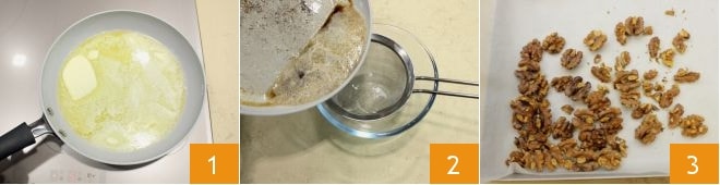 Um die Financiers mit Walnüssen und Pfirsichkonfitüre zuzubereiten, lassen Sie die Butter bei niedriger Hitze in einer großen Pfanne schmelzen 1 und rühren Sie mit einem Holzlöffel, bis sie braun wird: So erhalten Sie die beurre noisette, eine geschmolzene Butter mit haselnussbrauner Farbe, die golden gebraten wurde, um ein sehr besonderes Aroma zu entwickeln. Filtern Sie die beurre noisette in eine kleine Schüssel mit einem feinen Sieb 2 und lassen Sie sie abkühlen. Rösten Sie die Walnüsse bei 180° für 3-4 Minuten auf einem mit Backpapier ausgelegten Backblech 3;