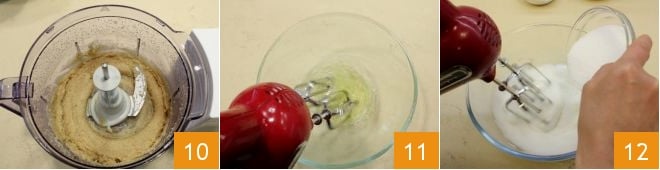 Aktivieren Sie den Mixer, um eine homogene Masse zu erstellen 10 und geben Sie dann den erhaltenen Teig in eine Schüssel. Trennen Sie in einem Behälter die Eigelbe vom Eiweiß und schlagen Sie das Eiweiß zusammen mit der Prise Salz 11: Wenn die Mischung weiß und schaumig wird, können Sie den restlichen Zucker hinzufügen 12.
