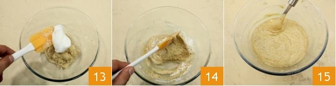 Geben Sie eine kleine Menge des geschlagenen Eiweißes hinzu 13 und rühren Sie mit einem Spatel, um die Masse zu erweichen; fügen Sie dann das restliche Eiweiß hinzu, indem Sie von unten nach oben mischen, um zu verhindern, dass es zusammenfällt 14, bis die Masse glatt und homogen ist 15.