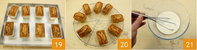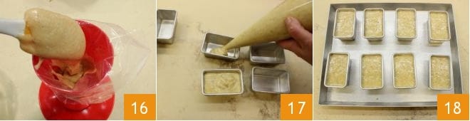 Geben Sie den erhaltenen Teig in einen Spritzbeutel ohne Tülle, bei dem Sie ein Loch machen können 16. Fetten Sie 8 rechteckige Förmchen mit den Maßen 8x5,5x4 cm ein und füllen Sie diese zu ¾ mit etwa 95 g Teig 17. Wenn Sie fertig sind 18, backen Sie die Financiers im vorgeheizten statischen Ofen bei 170° für 25 Minuten (oder 150° für 15 Minuten bei Umluft).