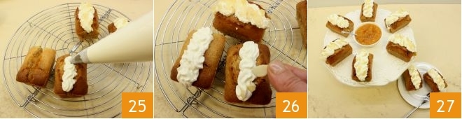 Garnieren Sie die Oberfläche der Financiers mit der Schlagsahne (die Füllöffnung abdeckend) 25 und verteilen Sie die Mandelblättchen darüber 26: Ihre Financiers mit Walnüssen und Pfirsichkonfitüre sind bereit zum Servieren 27.