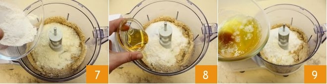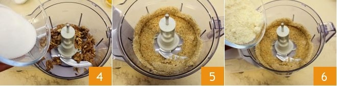 geben Sie die gerösteten Walnüsse und die Hälfte des Zuckers in einen Mixer 4, der das Öl aufnimmt, das die Walnüsse während des Mahlens freisetzen. Aktivieren Sie die Klingen intermittierend (um ein Überhitzen der Walnüsse zu vermeiden), um ein Mehl zu erhalten 5. Fügen Sie dem Mixer das Mandelmehl hinzu 6,
