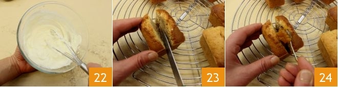 Wenn sie fertig ist 22, geben Sie sie in einen Spritzbeutel mit Sterntülle. Nach der erforderlichen Zeit können Sie die Financiers füllen: Machen Sie einen kleinen vertikalen Schnitt entlang der langen Seite, ohne den Boden zu erreichen, und öffnen Sie die Leckerbissen dann vorsichtig 23; füllen Sie das Innere mit einem Teelöffel mit Pfirsichkonfitüre 24 (Sie können sich auch mit einem Spritzbeutel ohne Tülle, bei dem Sie ein Loch machen können, helfen).