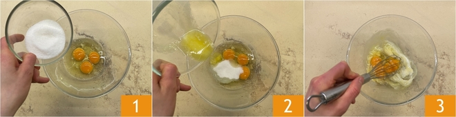 Um die finnischen Pfannkuchen zuzubereiten, geben Sie die Eier, den Zucker 1 und die lauwarme geschmolzene Butter 2 in eine Schüssel. Rühren Sie kräftig mit einem Schneebesen 3.