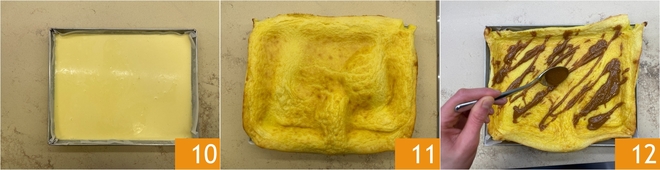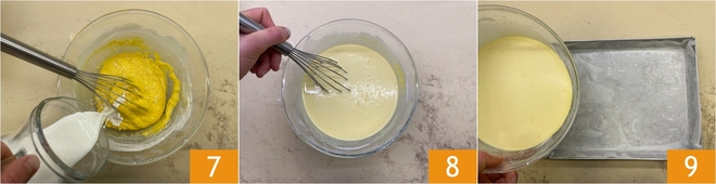 Gießen Sie die Milch langsam hinzu 7, während Sie weiter mit dem Schneebesen rühren, bis Sie eine glatte, homogene und klumpenfreie Masse erhalten 8. Fetten Sie ein rechteckiges 20x30 cm Blech ein und legen Sie es mit Backpapier aus. Gießen Sie den Teig hinein.