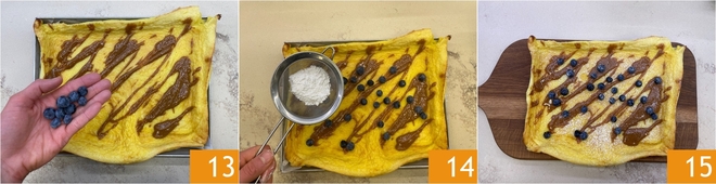 Vervollständigen Sie das Gericht mit frischen Heidelbeeren 13 und Puderzucker 14. Ihr finnischer Pfannkuchen ist fertig 15, schneiden Sie ihn in Scheiben und servieren Sie ihn sofort!