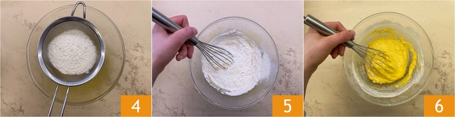 Sieben Sie das Mehl in die Schüssel 4 und rühren Sie gut mit einem Schneebesen 5, um Klumpen zu vermeiden 6.