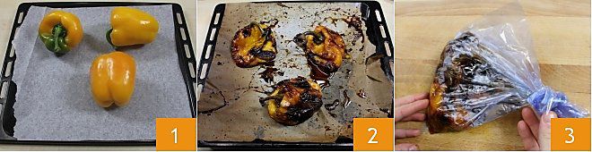 Um die falsche Carbonara zuzubereiten, beginnen Sie mit den gelben Paprika. Nachdem Sie diese gründlich gewaschen haben, legen Sie sie auf ein Backblech mit Backpapier 1. Backen Sie die Paprika bei 250 Grad im statischen Ofen für 40-45 Minuten (in einem Umluftofen bei 230 Grad für etwa 35 Minuten) 2. Sobald sie gekocht sind, legen Sie die Paprika in einen Beutel und lassen Sie sie etwa zehn Minuten abkühlen. Dieser Vorgang erleichtert das Ablösen der Haut und macht das Schälen einfacher 3.