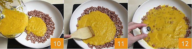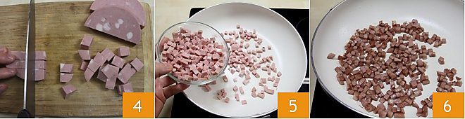 Während die Paprika abkühlen, nehmen Sie die Mortadella und schneiden Sie sie in Würfel 4. Danach braten Sie die Mortadellawürfel in einer großen, beschichteten Pfanne ohne Öl an 5, bis sie goldbraun sind 6.
