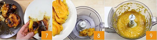 Nehmen Sie die Paprika und säubern Sie sie: Entfernen Sie den Stiel, die Haut und die Samen mit einem Messer 7. Sobald sie sauber sind, geben Sie die Paprika in den Mixer 8 und pürieren Sie sie, bis eine homogene Creme entsteht 9.