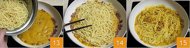 Wenn die Spaghetti al dente sind, lassen Sie sie abtropfen, wobei Sie darauf achten, 1-2 Schöpflöffel Kochwasser zurückzubehalten 13. Schwenken Sie die Spaghetti in der Paprika-Mortadella-Sauce direkt in der Pfanne, verlängern Sie mit 1-2 Schöpflöffeln Kochwasser und kochen Sie bei niedriger Hitze für ein paar Minuten, um alles zu vermischen 14. Fügen Sie einen Schuss natives Olivenöl extra hinzu und Ihre falsche Carbonara ist fertig!15