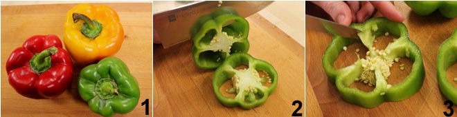 Um die Paprikablumen mit Eiern zuzubereiten, beginnen Sie damit, die Paprika gut zu waschen: Wählen Sie Paprika, die keinen geraden und regelmäßigen Umfang, sondern einen "gezackten" 1 haben, sodass die Scheiben die Form einer Blume haben. Schneiden Sie sie mit einem scharfen Messer in etwa 2 cm dicke Scheiben 2 und entfernen Sie den mittleren Teil der Scheiben 3.