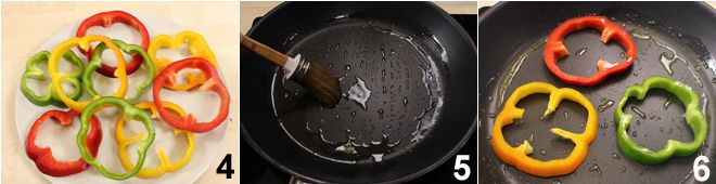 Verfahren Sie auf die gleiche Weise mit den roten, gelben und grünen Paprika. Bestreichen Sie eine antihaftbeschichtete Pfanne mit etwas nativem Olivenöl extra 5 und legen Sie die Paprikaringe hinein, wenn das Öl heiß ist 6. Lassen Sie sie einige Sekunden lang auf einer Seite bräunen und drehen Sie sie dann auf die andere Seite.