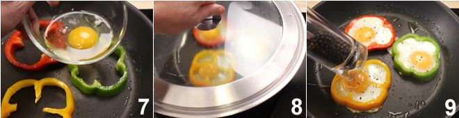 Schlagen Sie ein Ei in eine kleine Schale auf, achten Sie darauf, das Eigelb nicht zu beschädigen, und gießen Sie es dann vorsichtig in den Paprikaring 7. Verfahren Sie ebenso mit den anderen Eiern. Decken Sie nun die Pfanne mit einem Deckel ab 8 und lassen Sie die Eier bei mittlerer Hitze kochen. Schalten Sie die Hitze aus, wenn das Ei den von Ihnen gewünschten Gargrad erreicht hat.