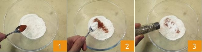 Um das Fish and Chips vom Seeteufel zuzubereiten, bereiten Sie zunächst den Teig vor. Geben Sie das Reismehl in eine Schüssel, fügen Sie das Paprikapulver 1 und das Backpulver für salzige Zubereitungen 2 hinzu. Geben Sie eine Prise Pfeffer 3 und Salz dazu,