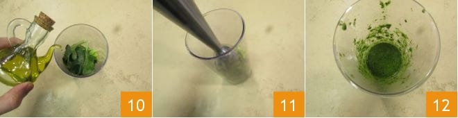 Gießen Sie dann auch das Öl 10 hinzu und pürieren Sie alles mit einem Stabmixer 11 bis Sie eine Creme erhalten 12.
